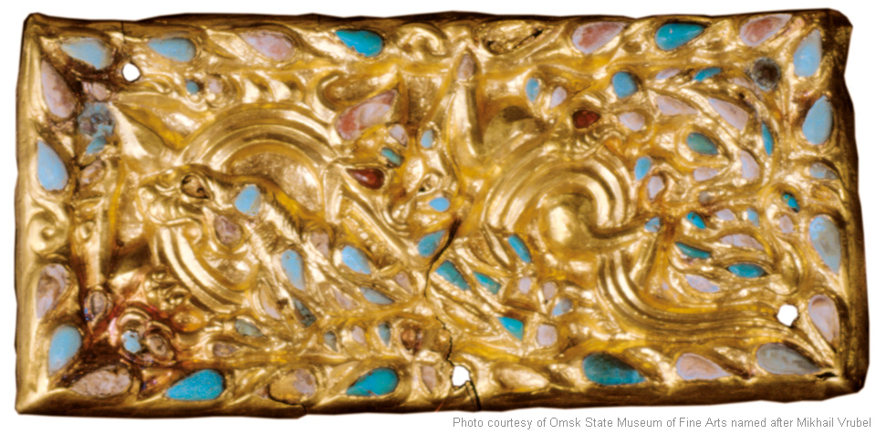 Gürtelplatte. Hünengrab Sidorovka. Waldsteppe Irtysch-Region. Gebiet Omsk. II. Jahrhundert vor unserer Zeitrechnung – II. Jahrhundert nach unserer Zeitrechnung (II.–IV. Jahrhundert unsere Zeitrechnung). Gold, Silber, Türkis, Korallen, Bernstein