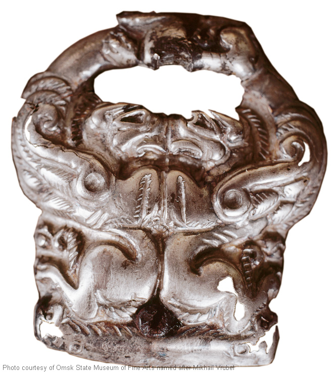 Gürtelbelag. Hünengrab Sidorovka. Waldsteppe Irtysch-Region. Gebiet Omsk. II. Jahrhundert vor unserer Zeitrechnung – II. Jahrhundert nach unserer Zeitrechnung (II.–IV. Jahrhundert unsere Zeitrechnung). Silber, Eisen
