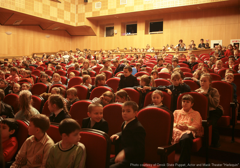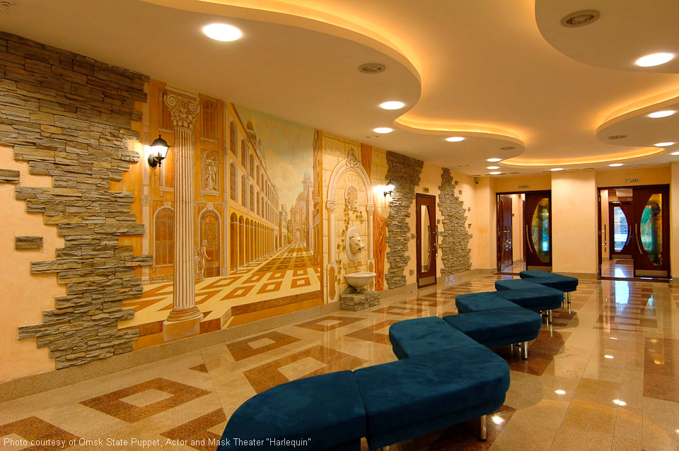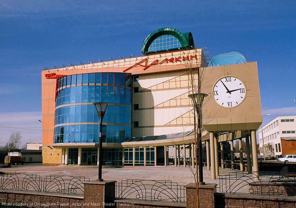 Omsker staatliches Theater für Puppen, Schauspieler, Maske „Harlekin“. Außen- und Innenausstattung