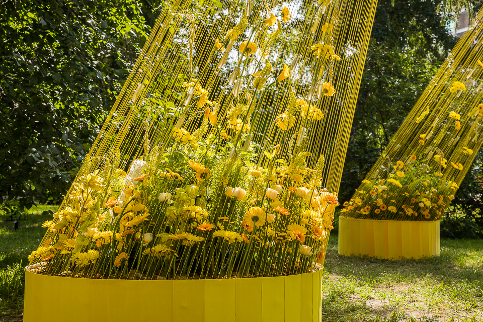 «Лучи знаний» изо всех оттенков желтого словно посланы нам свыше Живые цветы тянутся вверх, навстречу источнику этого света Издалека это выглядит максимально футуристично