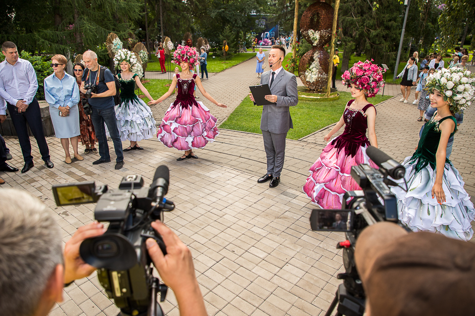 В 10:30 в Выставочном сквере появляются юные воспитанницы студии «Алиса» Начинается большая экскурсия по ежегодной выставке зеленого строительства Она проводится для руководителей города и делегаций, прибывших в Омск на праздник