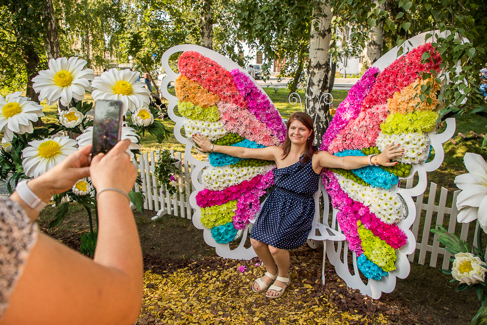 Повсюду размещены полюбившиеся омичам цветочные фотозоны Многие искусственные цветы неотличимы от настоящих Ненадолго стать бабочкой так легко и, главное, — так красиво!