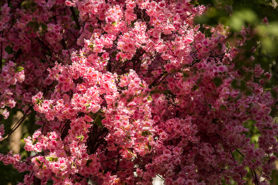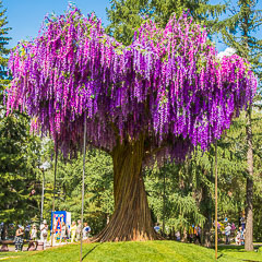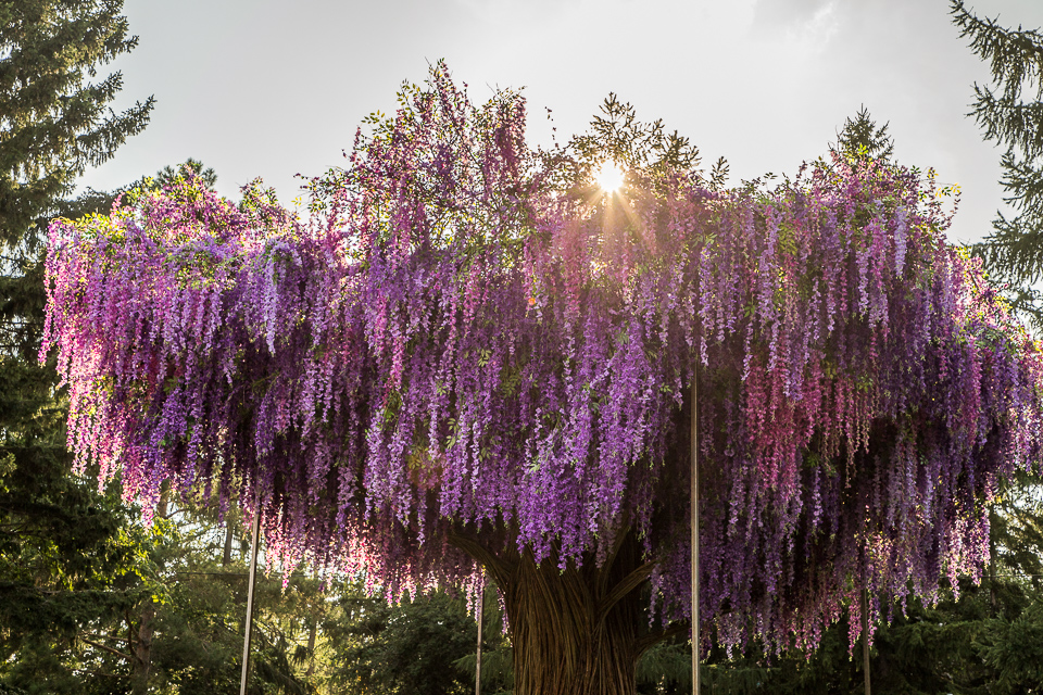 Диаметр кроны — 6 метров, в ней сочетаются живые и искусственные цветы