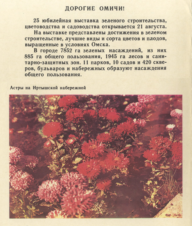 Окраинные посёлки постепенно вливались в Омск, добавляя ему зелёных уголков. Но и центральная, историческая часть города, и его промышленные районы утопали в зелени. Весной цвели и благоухали черёмуха и сирень, вдоль дорог белели яблони. Летом весь город был украшен цветами всевозможных видов, которые радовали омичей вплоть до осени. А зимой в городских дворах появлялись лесные птицы — снегири и свиристели прилетали по рябину и ранет.