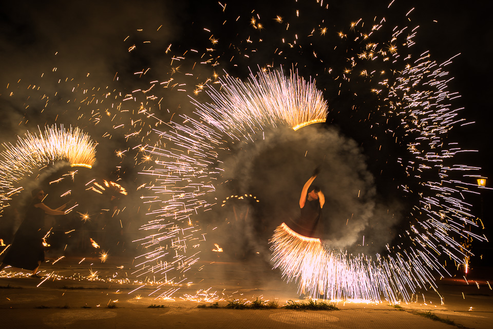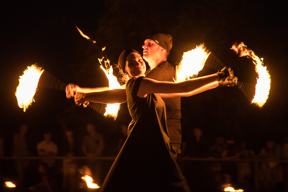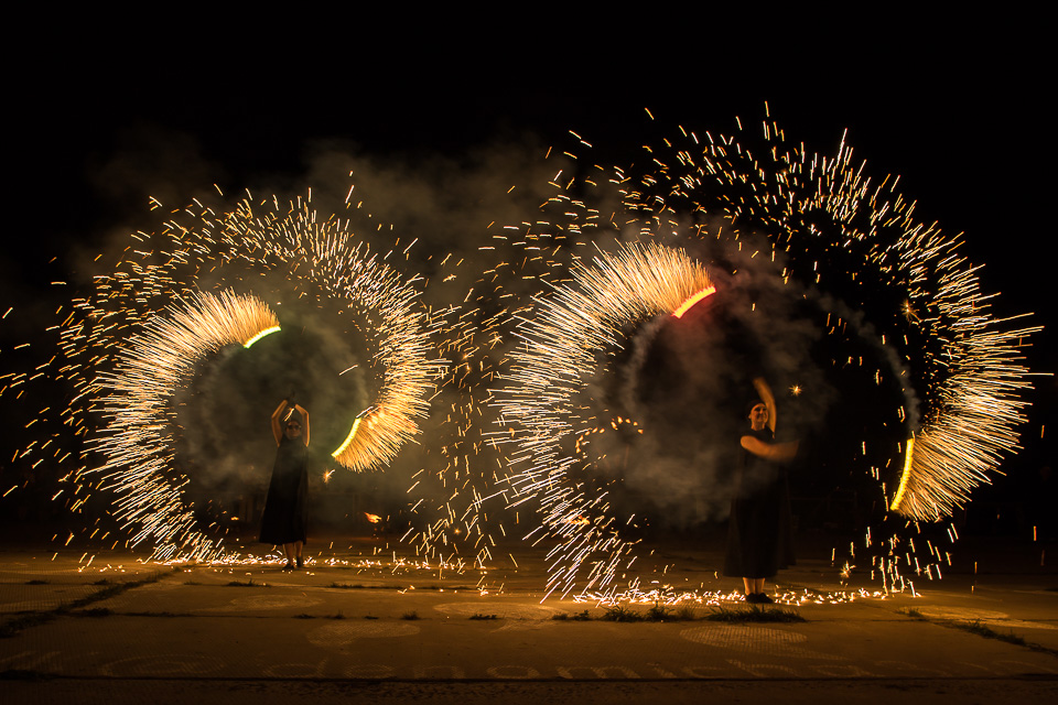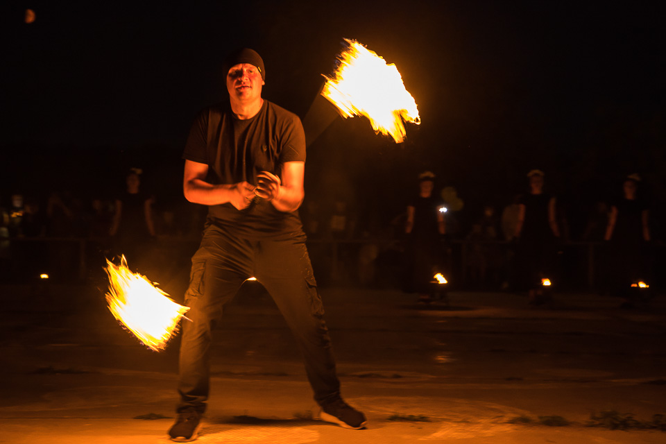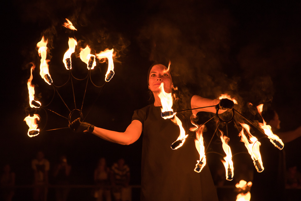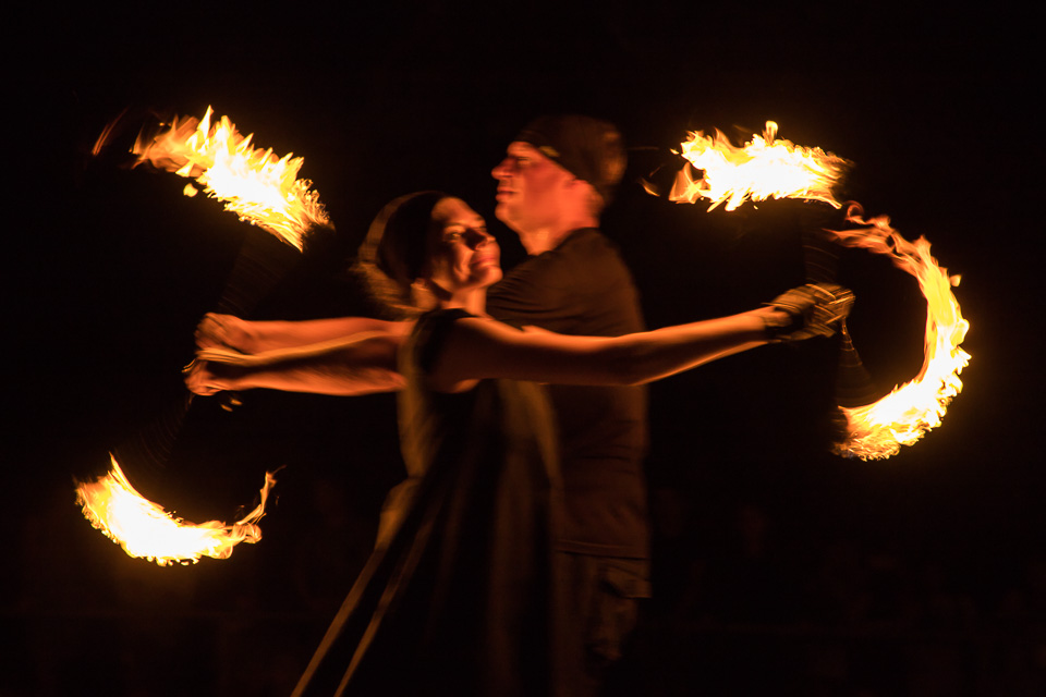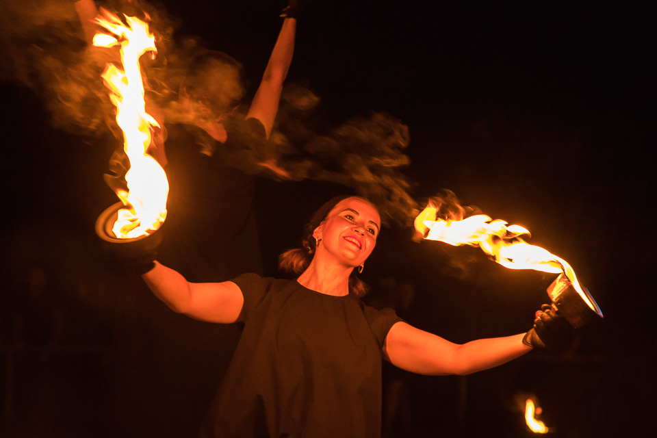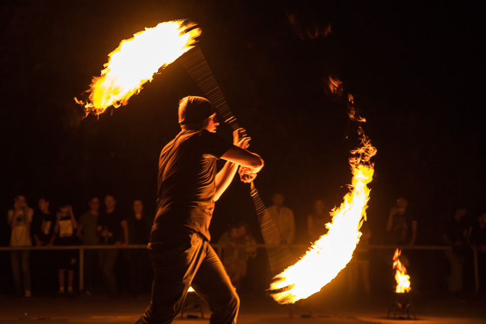 Вращение огненных предметов на большой скорости сразу покоряет публику