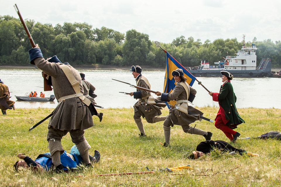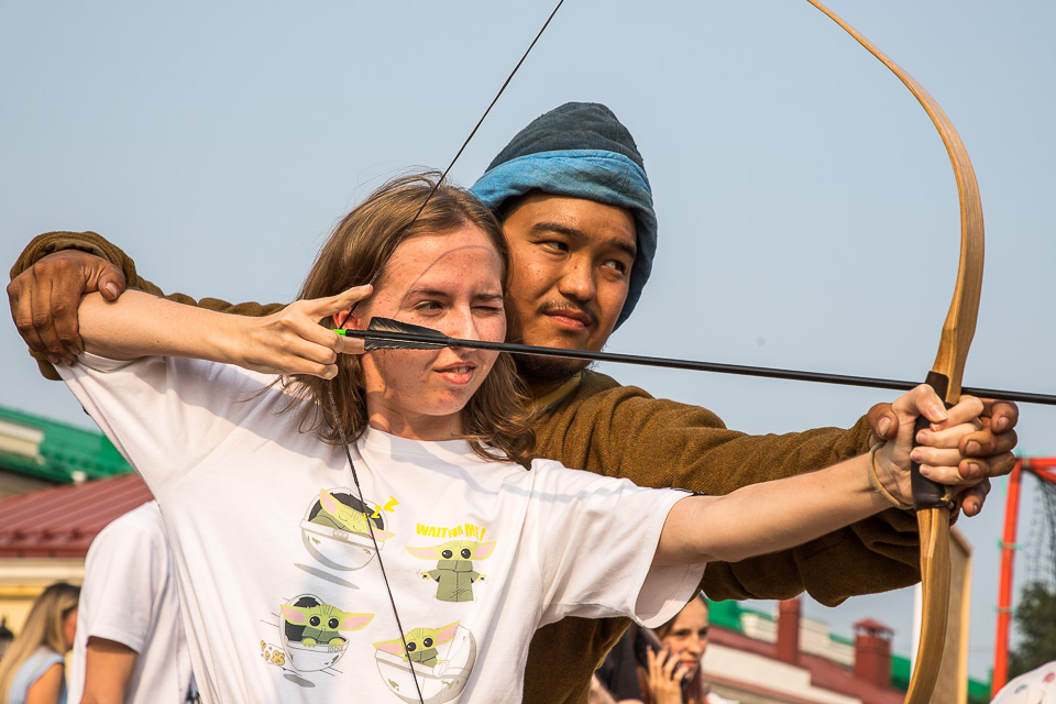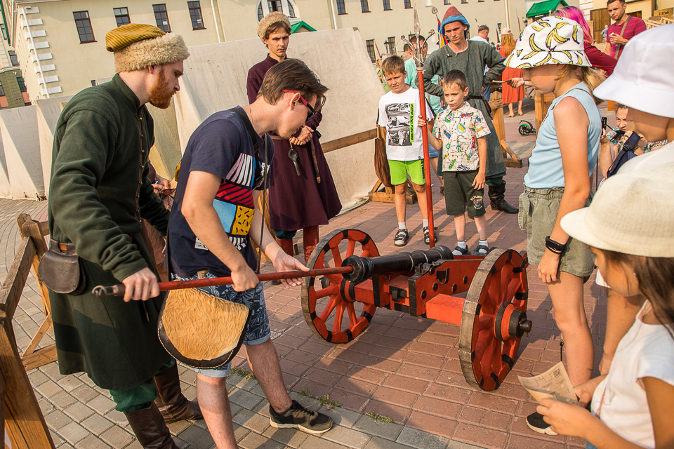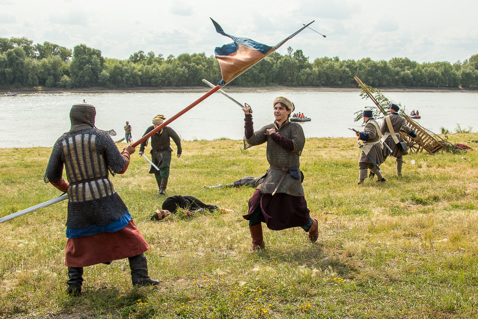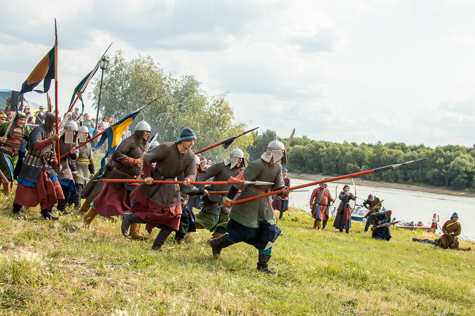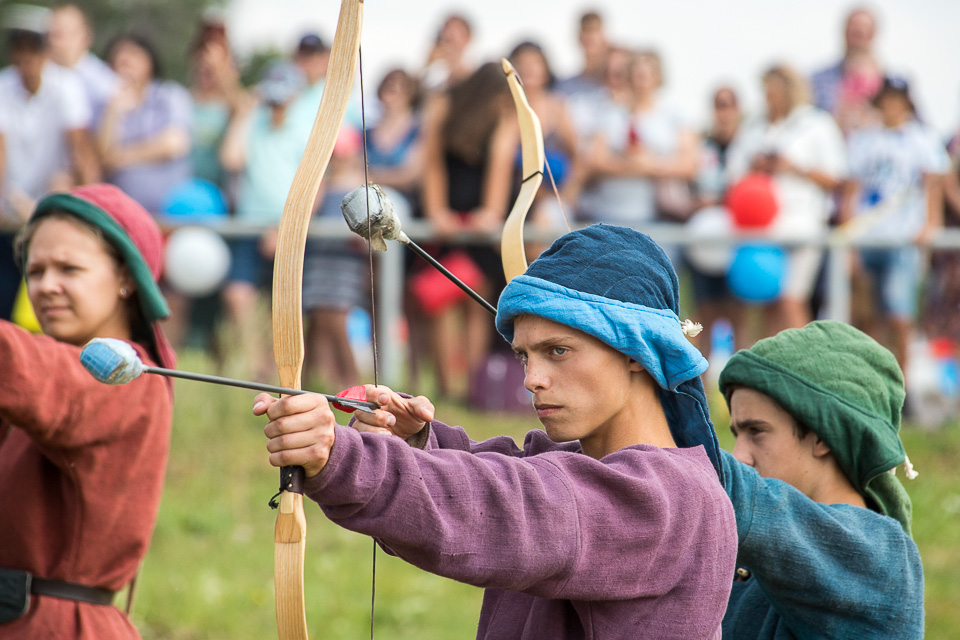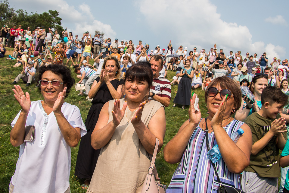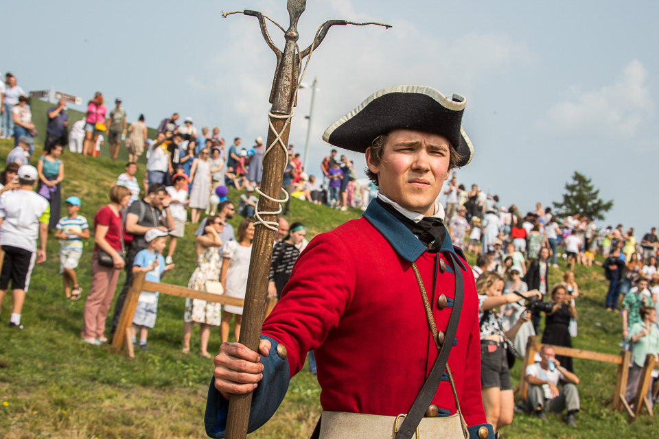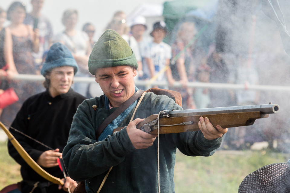 Восхищенные гости фестиваля аплодируют участникам реконструкции