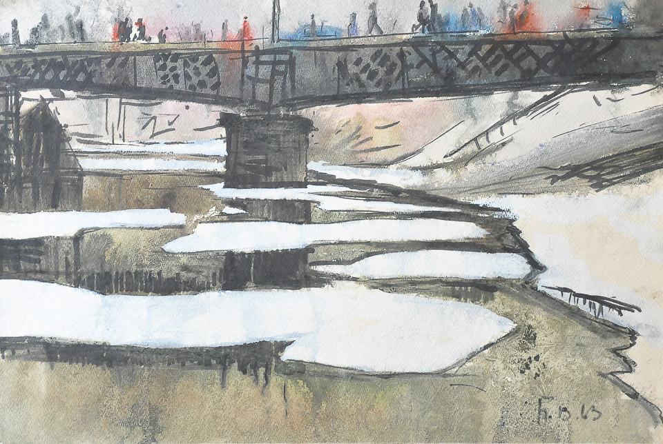 Василий Белан. Ледоход на Оми. Глубокая осень. Старый мост через реку Омь. 1963. Бумага, акварель, гуашь