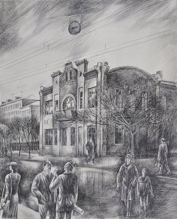 Борис Миронов. Утро. Город. Стрижка деревьев. 1991. Бумага, офорт