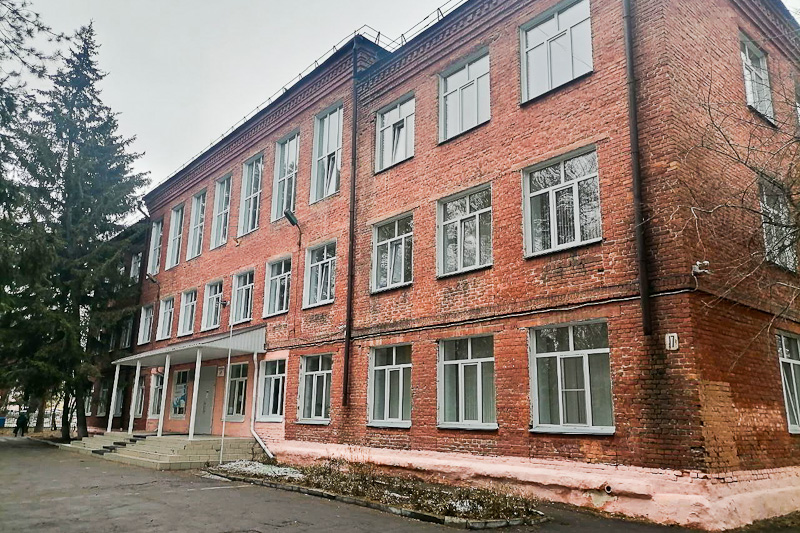 Здание школы кирпичное, трехэтажное, кровля скатная.