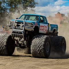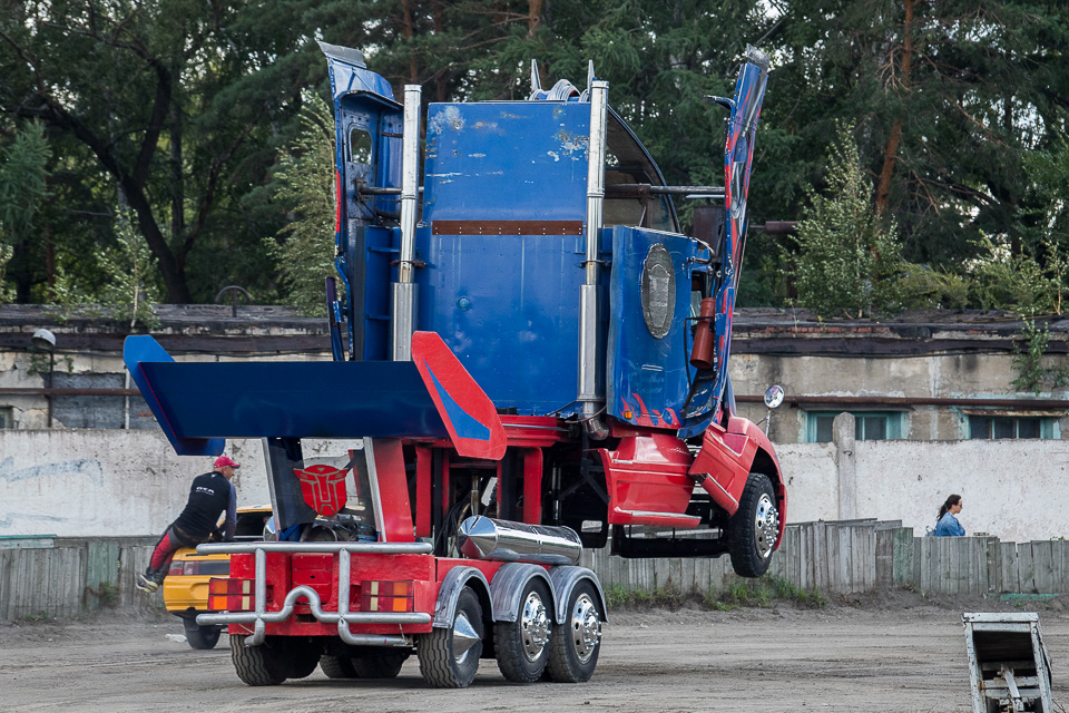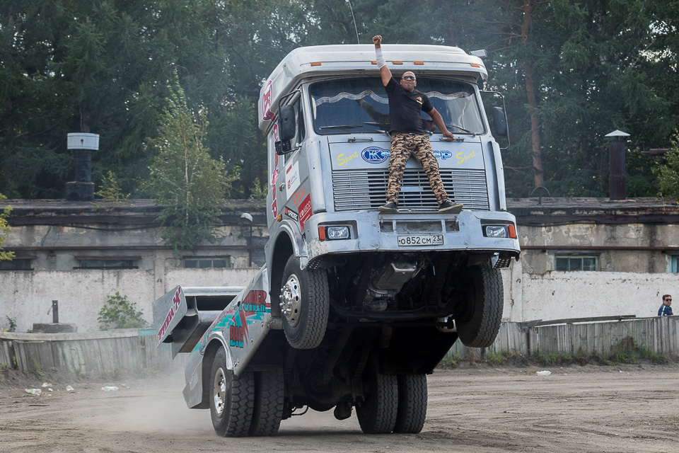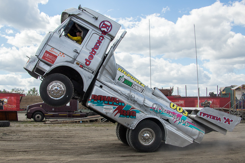 Внезапно появляется грузовик, который умеет вставать на задние колеса
