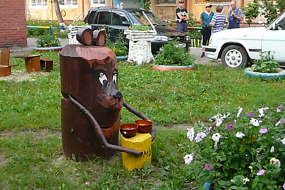 Сначала провели субботник: очистили двор от мусора, подстригли кусты, разбили цветники, позже из бревен соорудили беговую дорожку, песочницу, фигуры зверей. Вокруг дома высадили семь пирамидальных тополей.