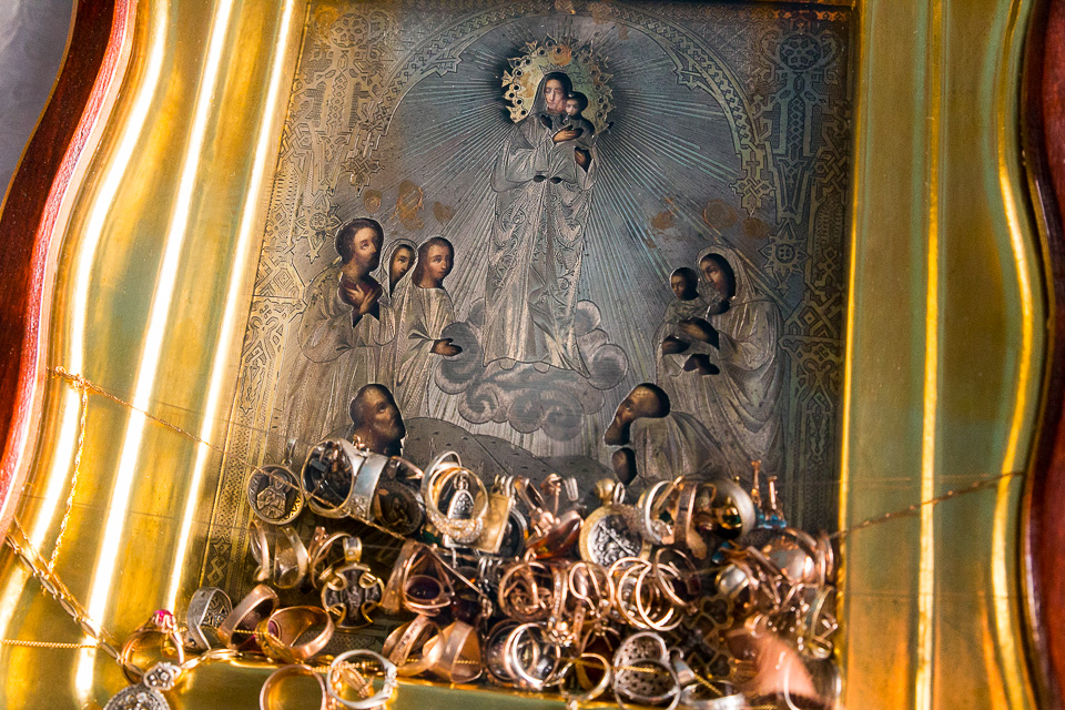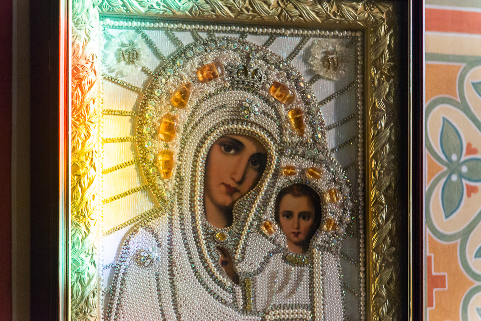 О трепетном отношении прихожан говорят их дары: вышитая натуральным жемчугом икона Божьей матери — один их них