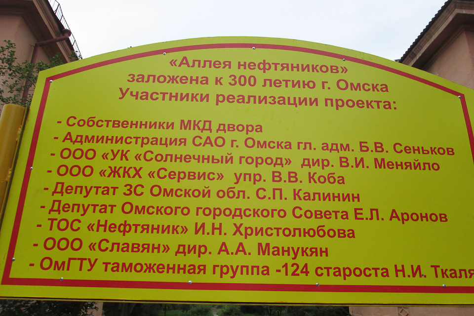 К юбилею города Омска собственники жилья дома № 18 по улице Малунцева и близлежащих домов совместно с управляющей компанией «Солнечный город» открыли аллею нефтяников. В центре двора была проложена новая асфальтовая дорожка, возле которой высажен газон, по обеим сторонам красуются 30 крупномерных берез и сосен.