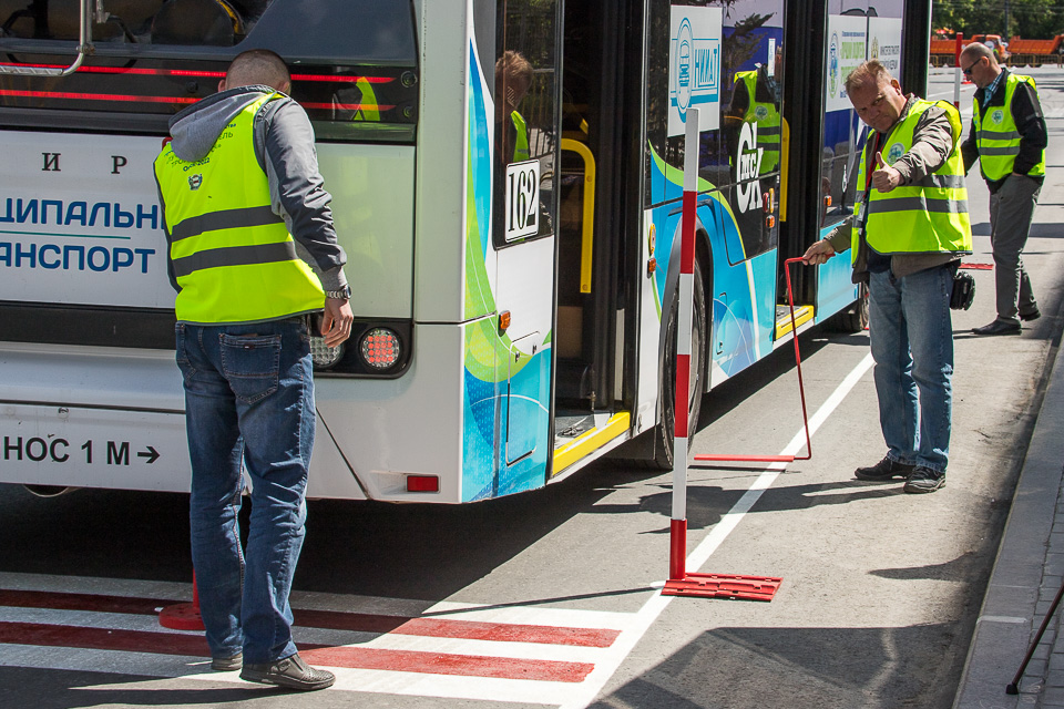 Судьи замеряют расстояние от троллейбуса до размеченного края платформы