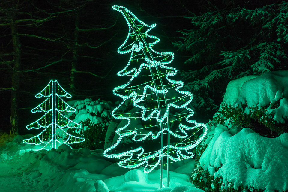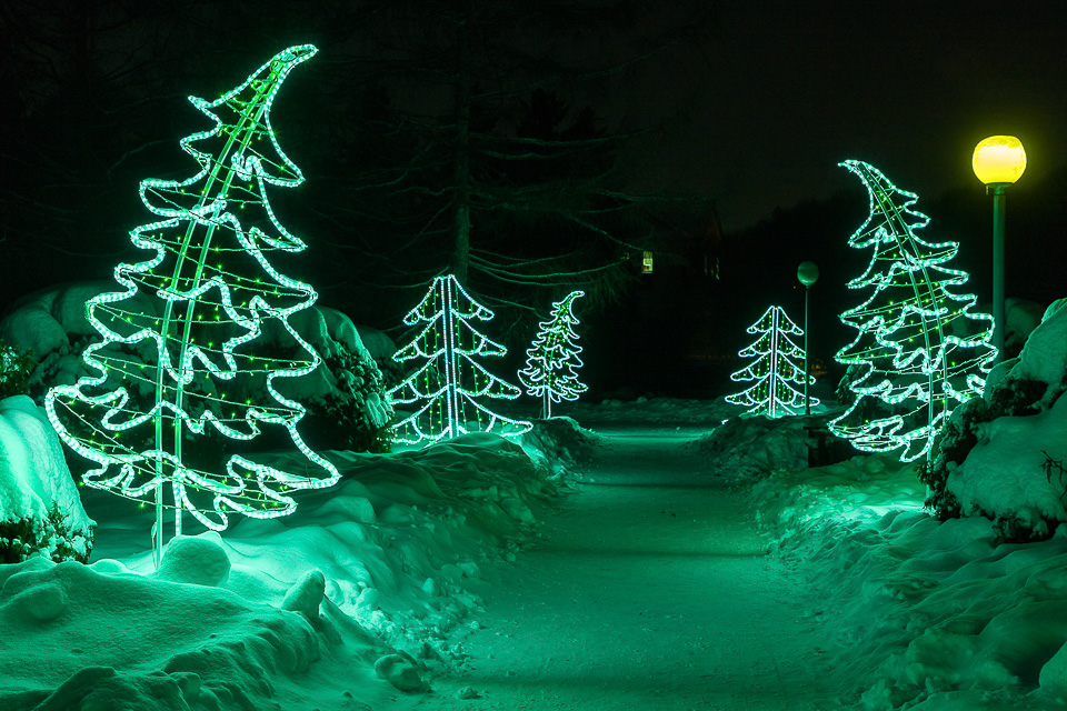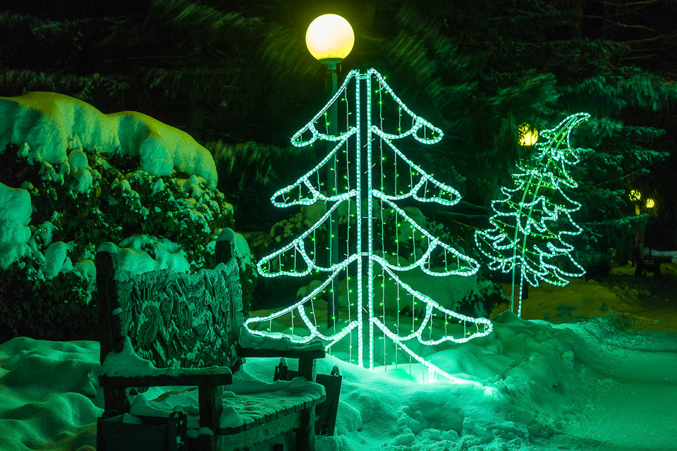 Близкое соседство искусственных и настоящих елей придает прогулке особый шарм
