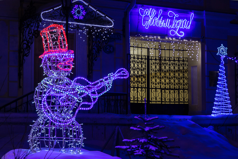 Лаконичные гирлянды очень идут старинному зданию драматического театра