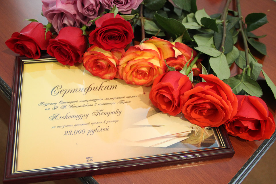 В администрации города прошла торжественная церемония награждения победителей ежегодного литературного конкурса молодых омских поэтов и прозаиков. Лауреатами молодежной литературной премии имени Ф.М. Достоевского в 2015 году стали Александр Петров, Елена Мачульская, Александр Тихонов и Ирина Четвергова.