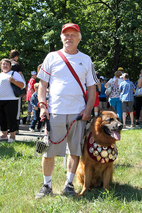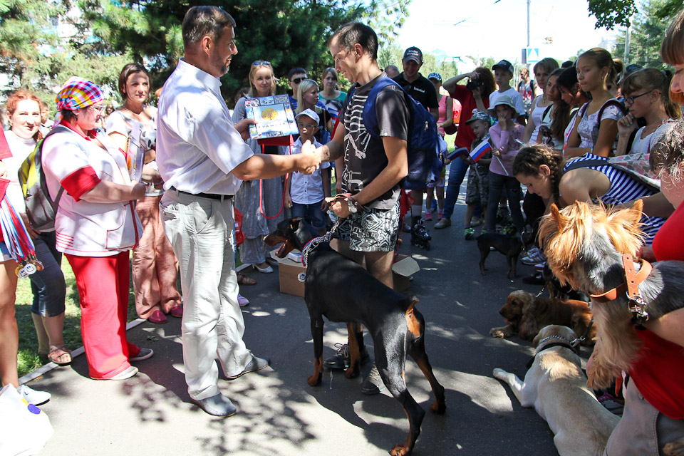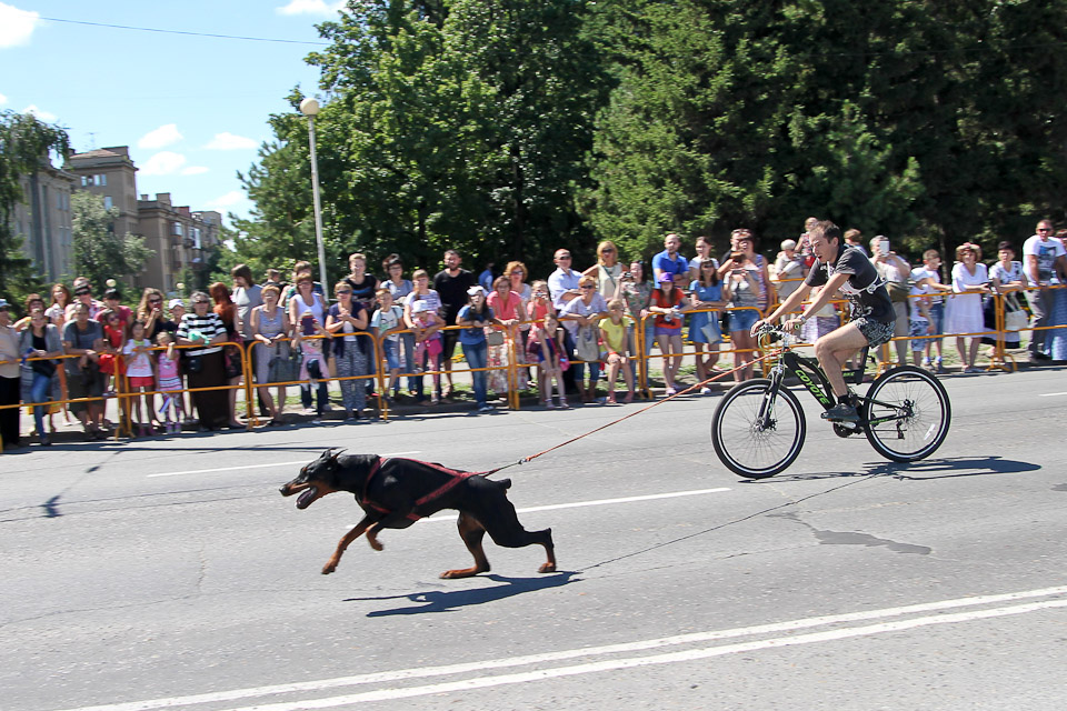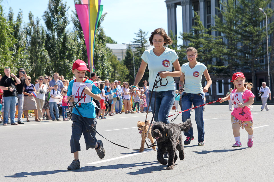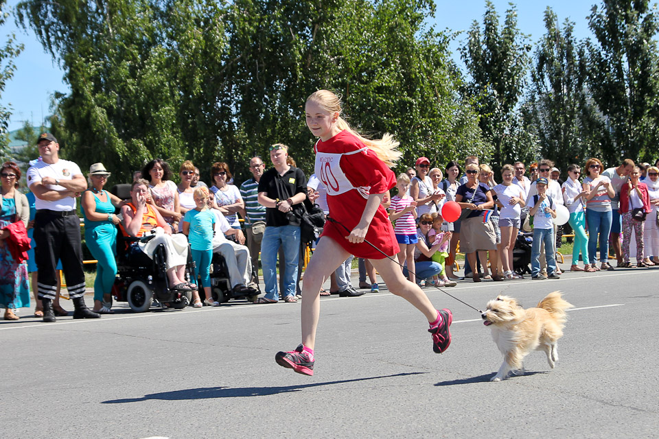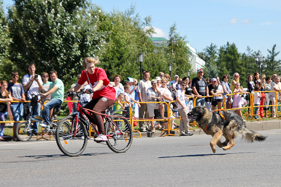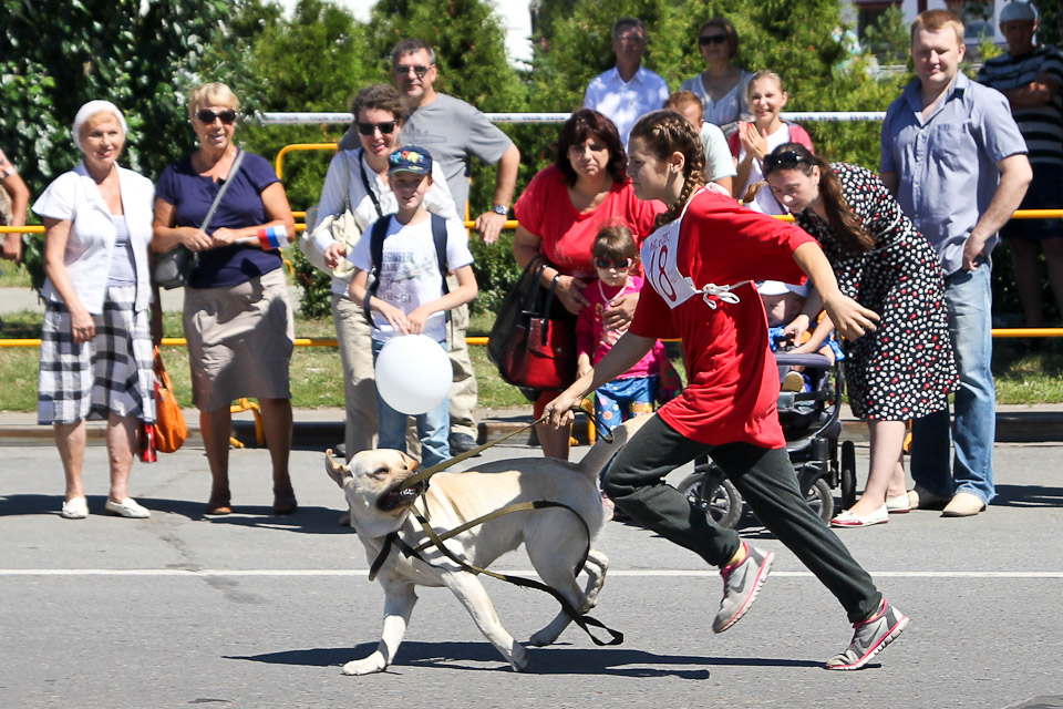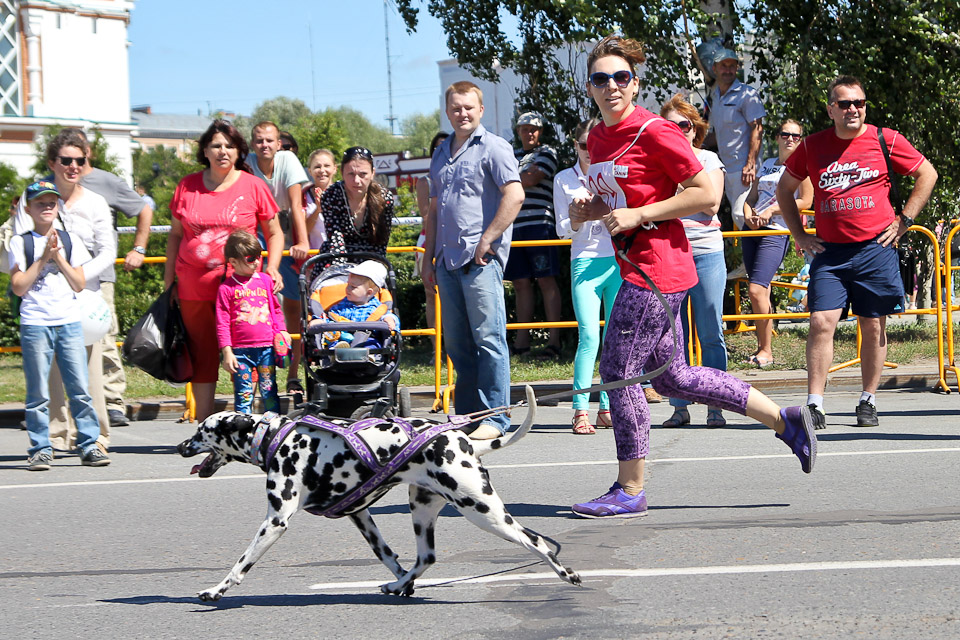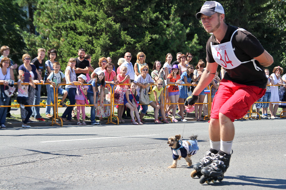 В День города по Соборной площади вновь вихрем пронеслись хвосты, лапы, поводки, ролики и байки. Счастливые дети с восторгом наблюдали за яркими соревнованиями. Традиционные кани-кросс (бег человека с собакой) и байк-джоринг (бег собаки с велосипедистом) в этот раз были дополнены новым видом состязаний — бегом человека на роликах с собакой.