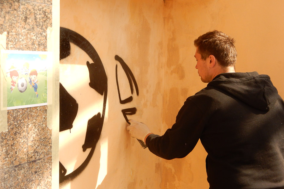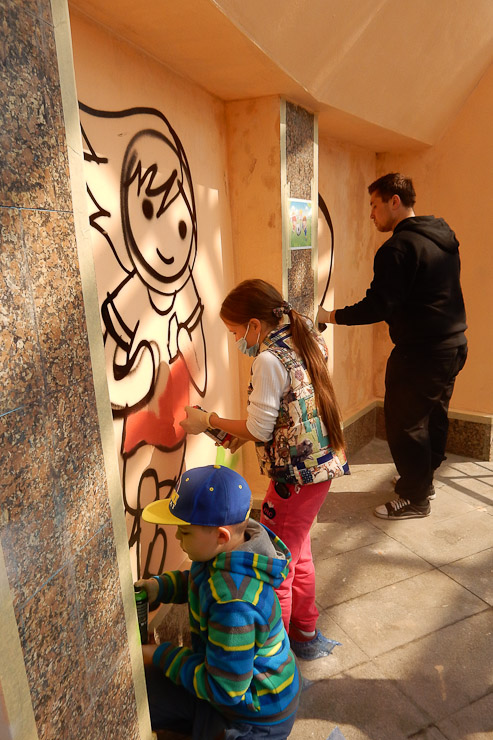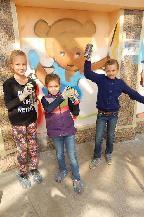 Бюджетное учреждение «Эксплуатация объектов внешнего благоустройства» обеспечило юным художникам необходимые условия для творчества. Работники предварительно подготовили стены перехода под роспись, очистили, выровняли. А предприятие на свои средства приобрело специальные баллончики с красками разных цветов. Ребята, их родители и художник Эдвин Франк оформляли стены перехода безвозмездно, в дар родному городу.