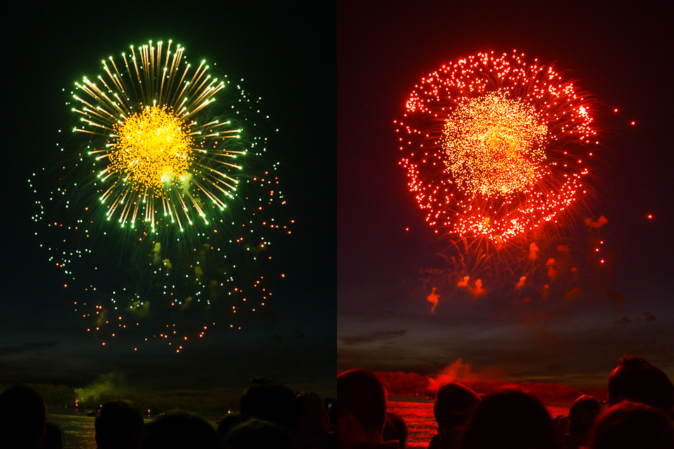 Первые залпы — не самые зрелищные Но вскоре небо «оживает» Цвет, форма, наложения варьируются от залпа к залпу