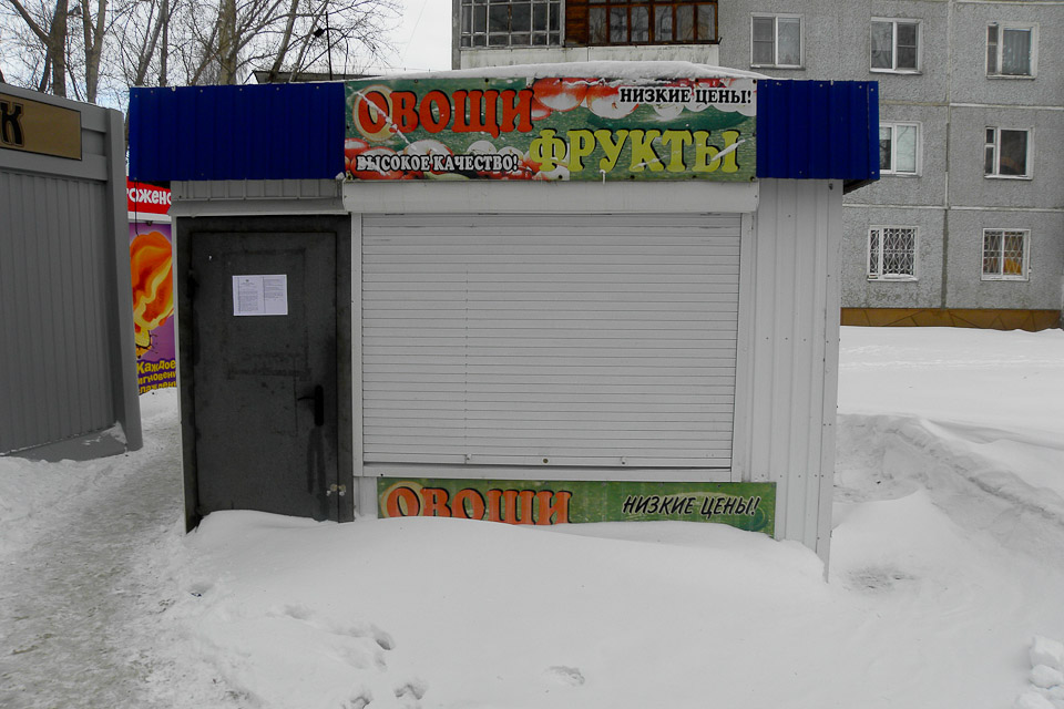 Какой неряшливый киоск: немытый, обклеенный объявлениями. Можно ли здесь купить что-то на стол?