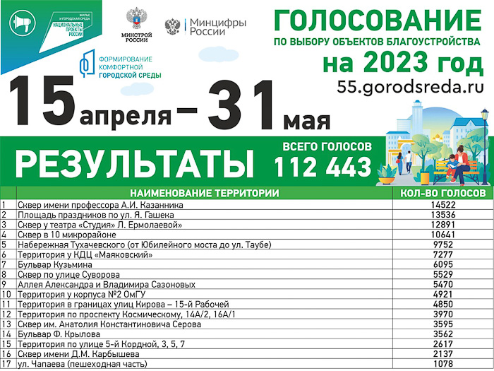 Голосование по отбору территорий для благоустройства в 2023 году по федеральному проекту «Формирование комфортной городской среды» проводилось с 15 апреля по 31 мая текущего года на единой федеральной платформе 55.gorodsreda.ru.