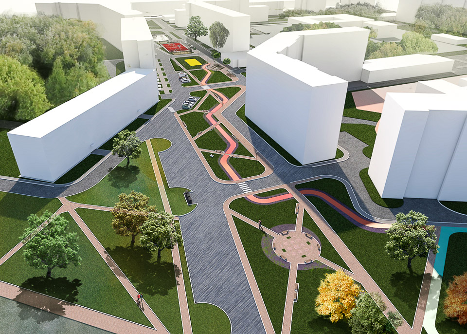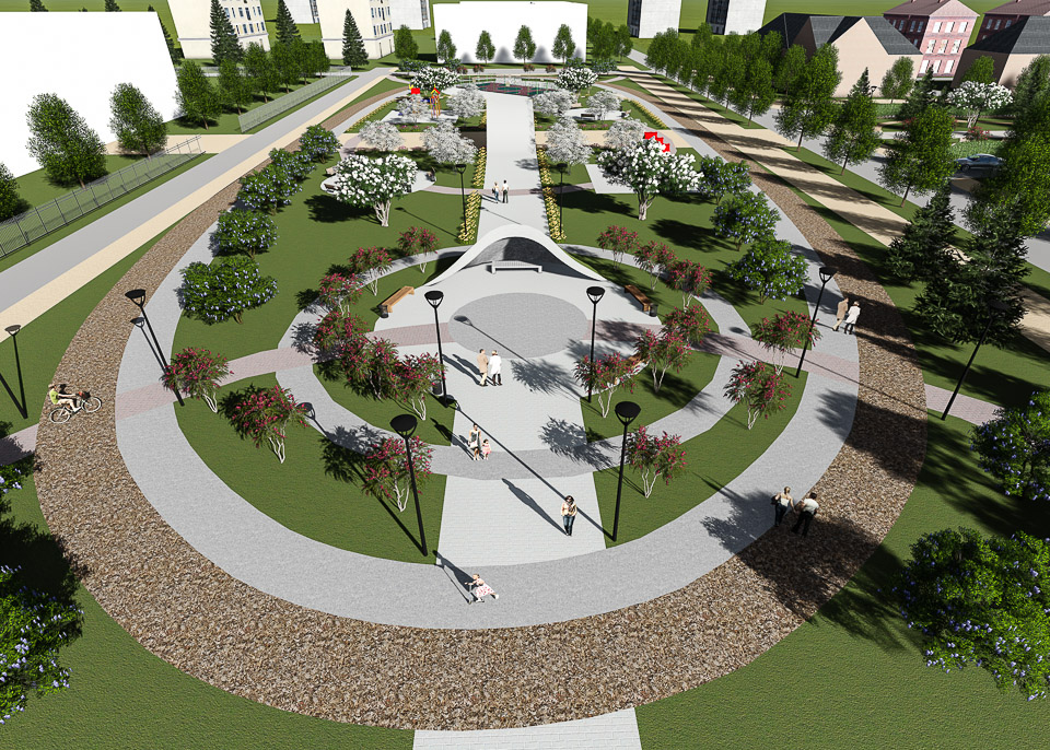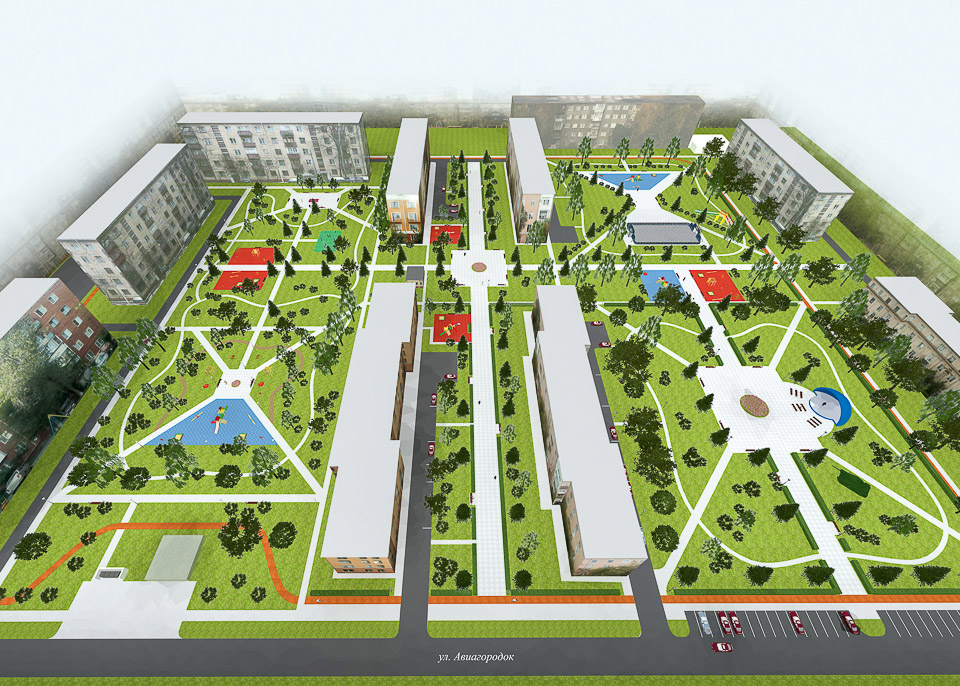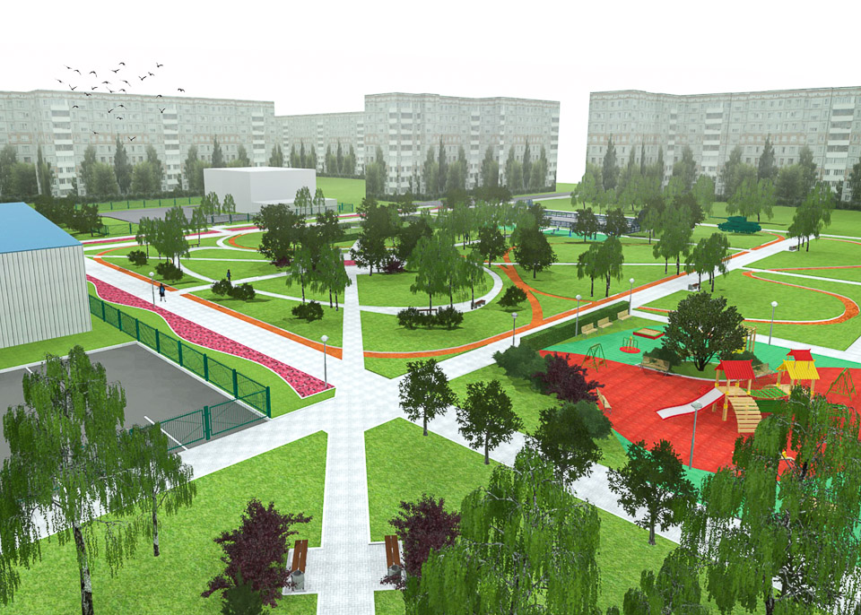 Привести в порядок тротуары и пешеходные дорожки, правильно, с учетом реальных потребностей горожан разместить игровые и спортивные площадки, поставить лавочки и урны, проложить велодорожку, восстановить газоны и разбить цветники, придумать, как грамотно разместить мини-площадки для спокойного отдыха, посадить деревья — и не «прутики», а полноценные крупномеры: в дизайн-проекте архитектор использовал «тактику малых дел», чтобы добиться максимального результата — создать пример по-настоящему комфортной городской среды в Комсомольском городке.