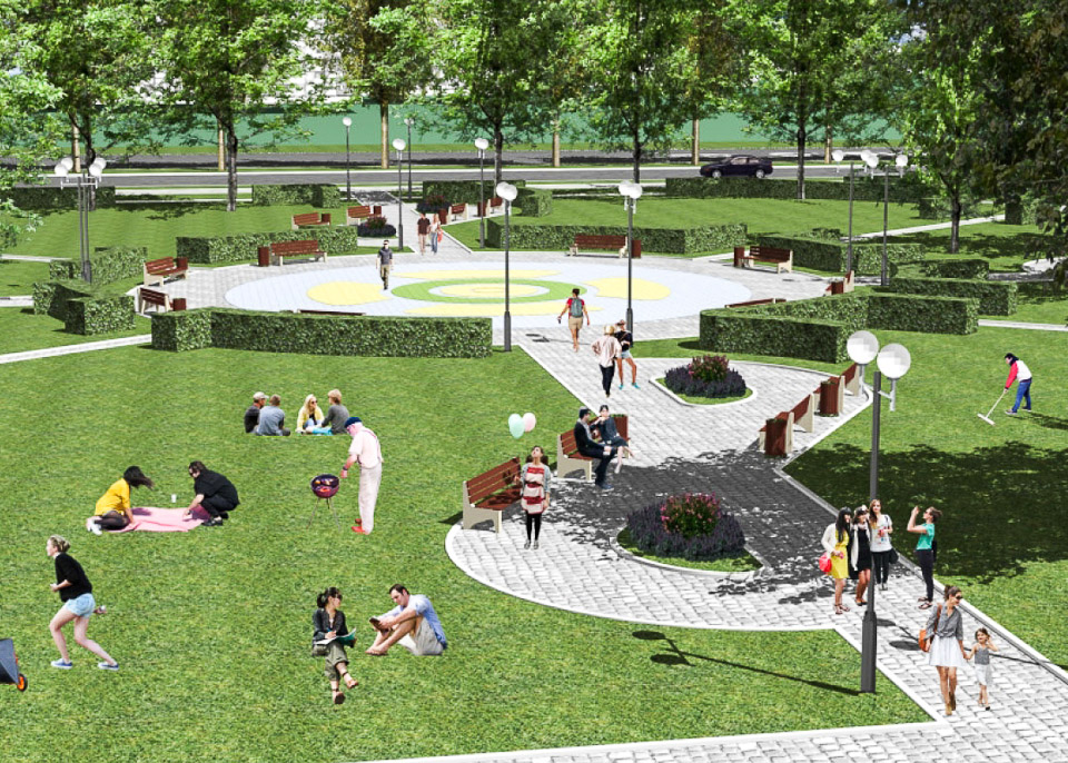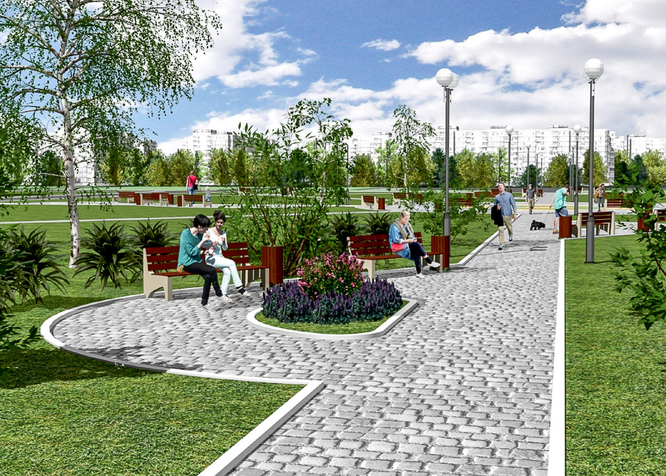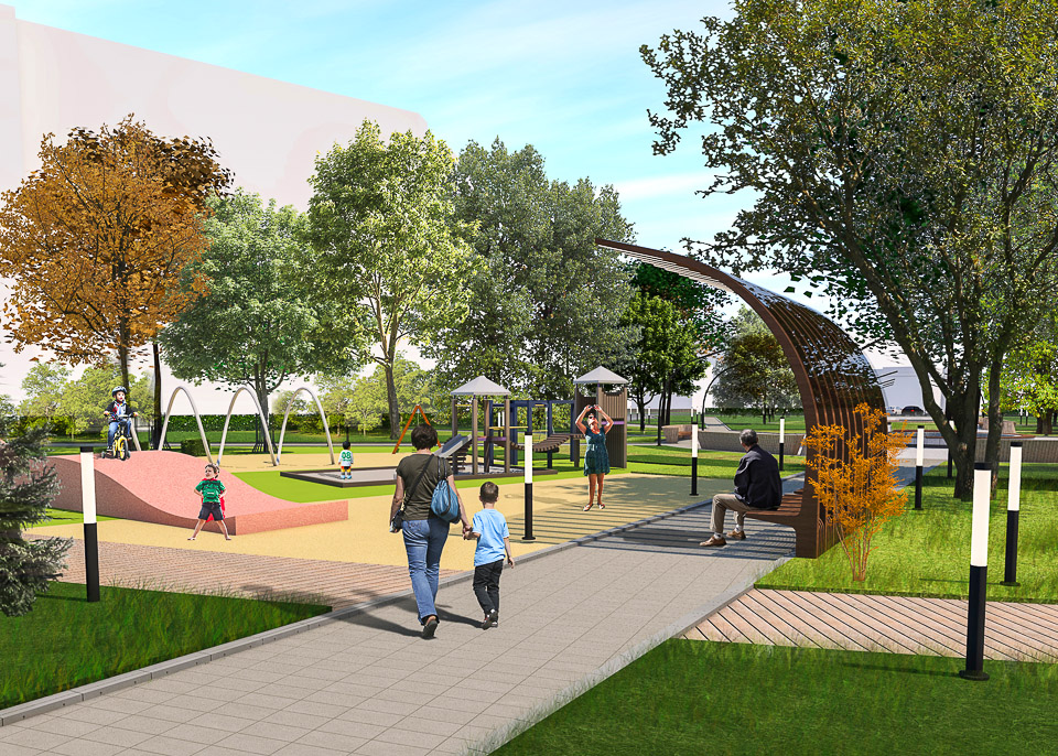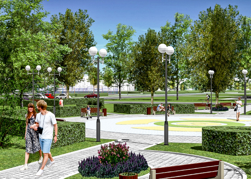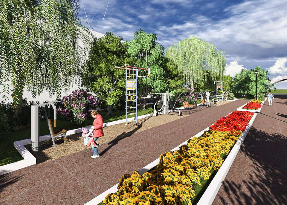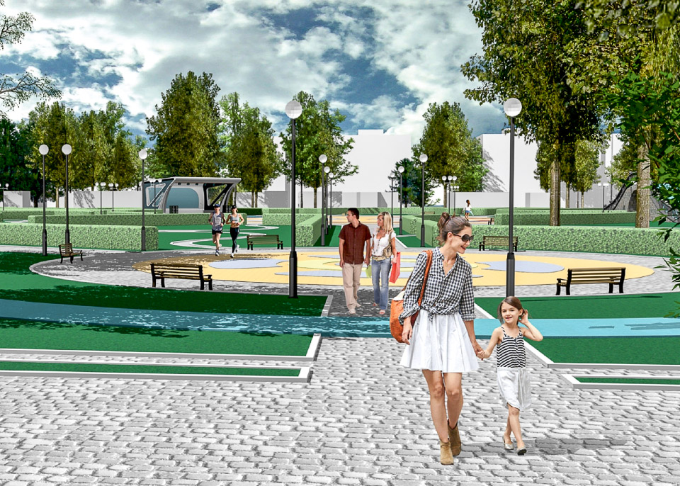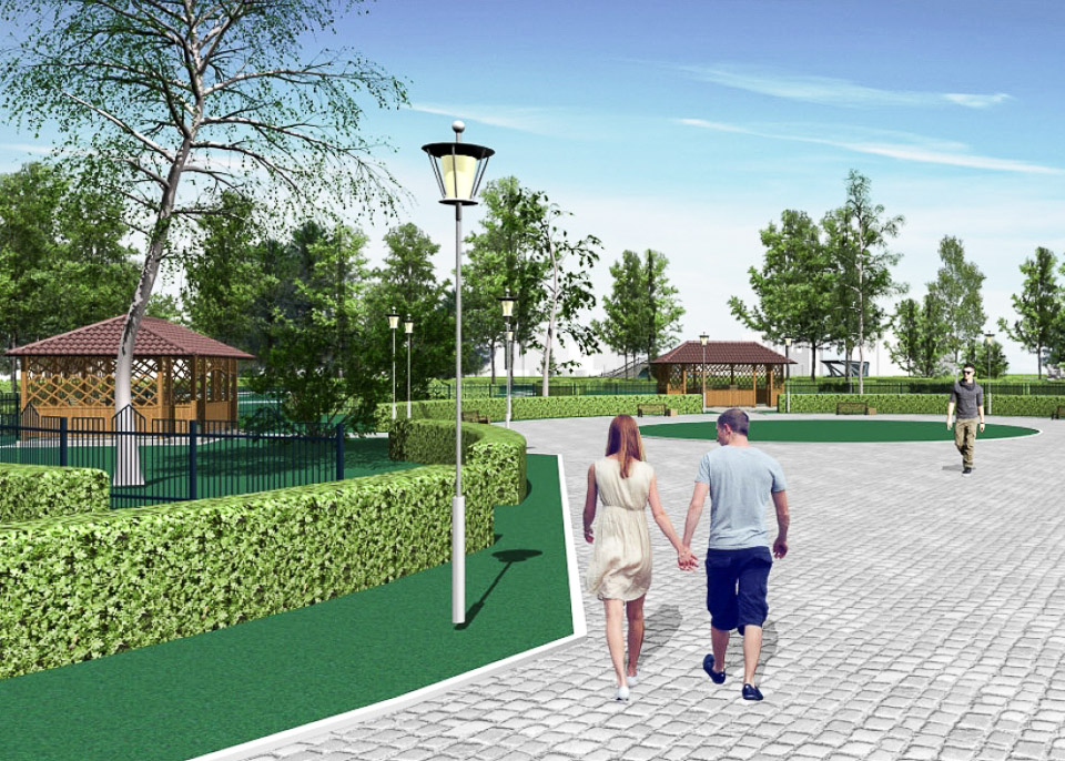 Начать предлагается с обустройства входной группы. Затем в парке появится детская площадка, спортивные сооружения, пешеходные дорожки и тенистые аллеи.