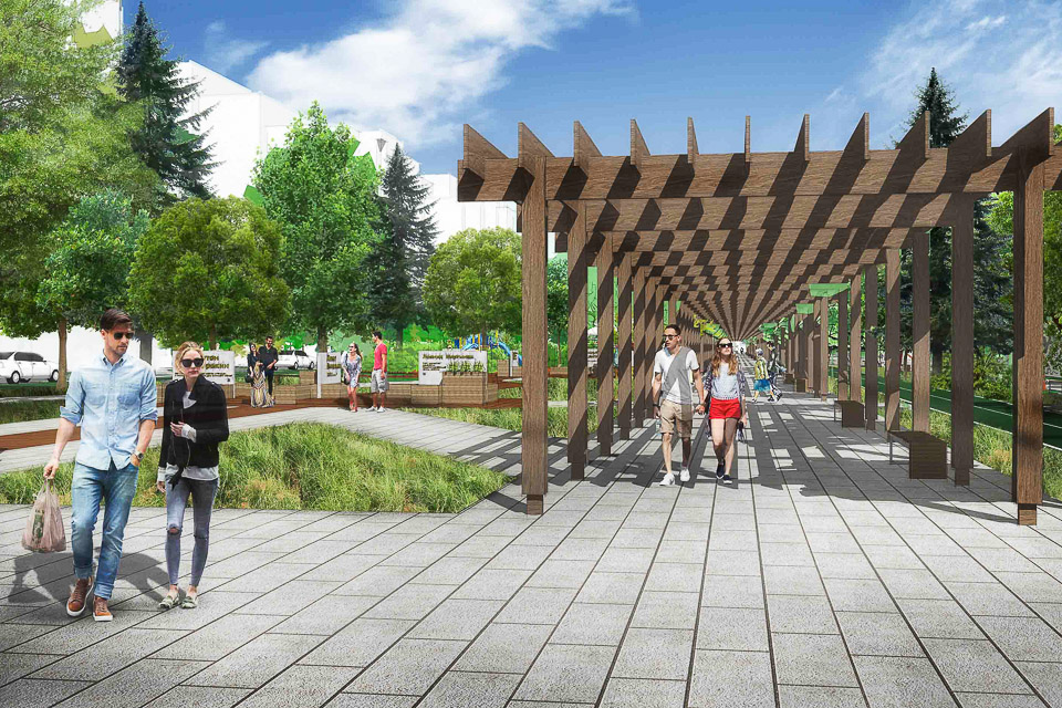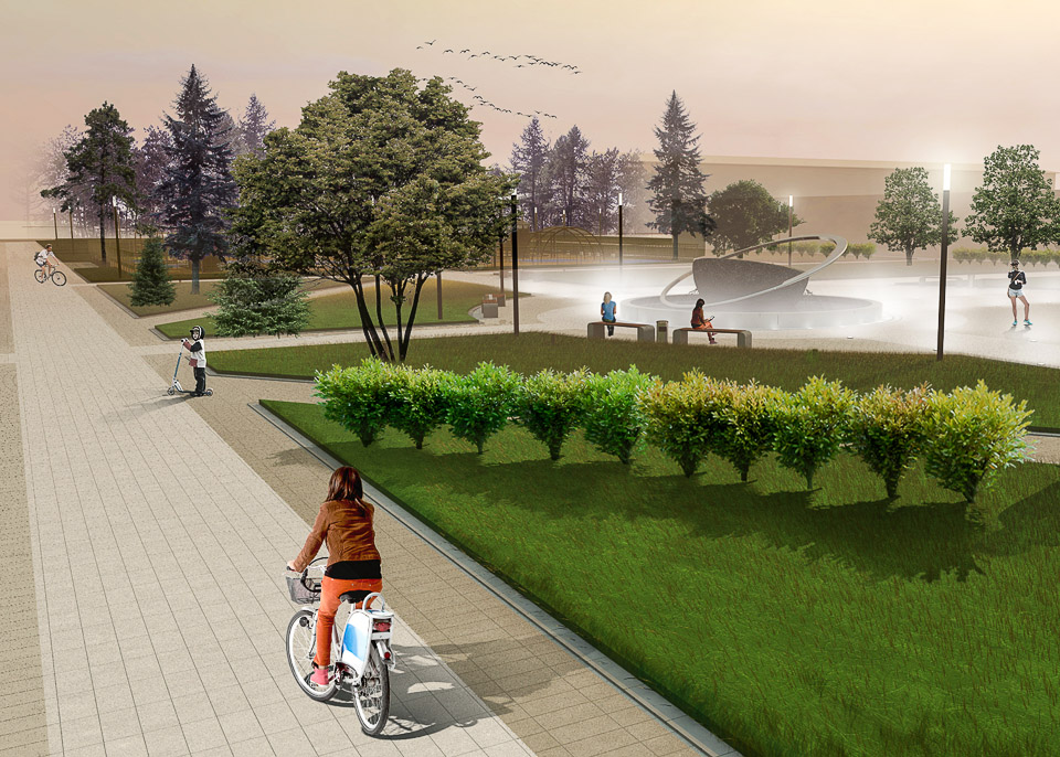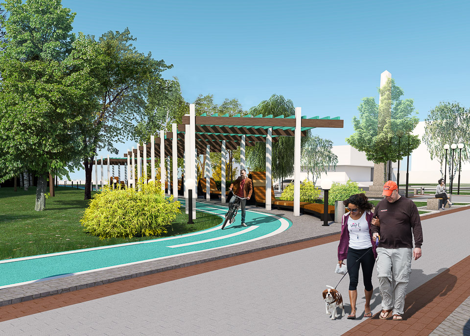 Здесь будет все для тихого отдыха — любимого вида досуга семей с детьми. Пешеходные дорожки, красивые и удобные малые архитектурные формы, необычная длинная скамья-лента и навесы, которые хорошо защитят от солнца в жаркий день, живые изгороди, о которых так долго мечтали местные жители, — конкретные архитектурные решения, предложенные в дизайн-проекте, небанальны и свежи. Учтены существующие пешеходные транзиты. Впрочем, сделано и важное дополнение — предусмотрено создание велодорожки.