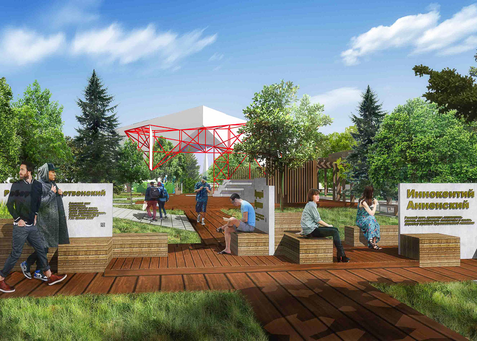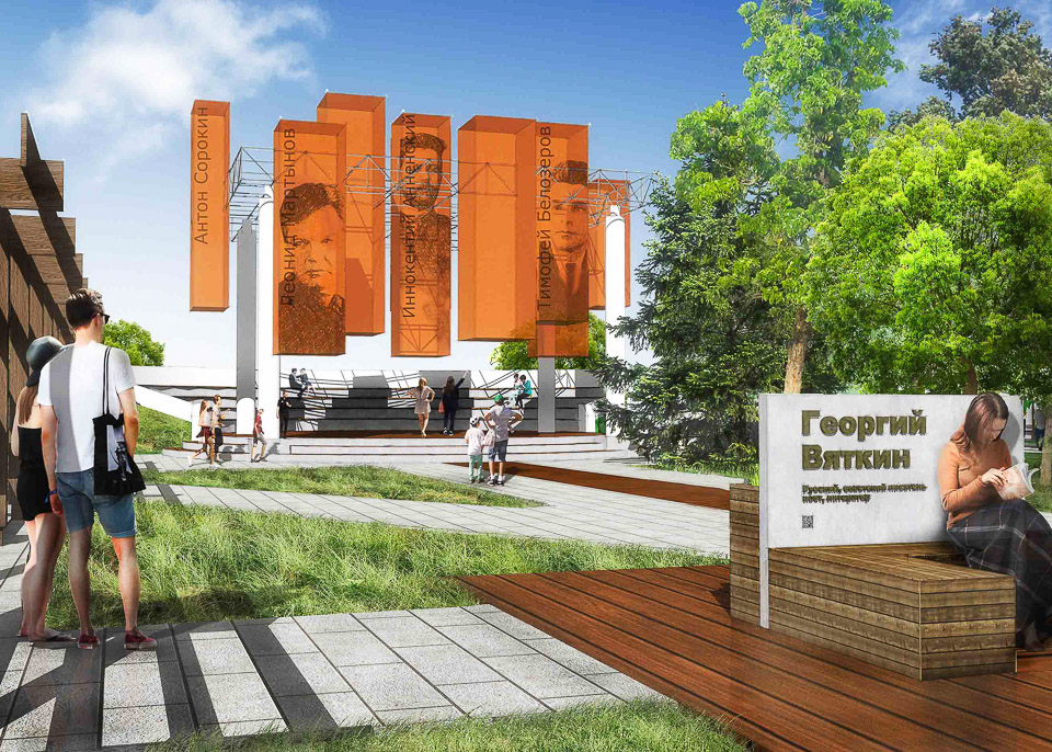 У коллектива архитекторов появилась смелая мысль — в рамках одной территории сформировать и удобный пешеходный транзит, и настоящий парк. Оригинальная уличная мебель, новые зеленые насаждения, оригинальные ландшафтные решения… Все это задумывается как знаковая форма нового прочтения городского памятного места, нового обозначения топонимической характеристики. Хорошая идея омских краеведов по увековечиванию памяти литераторов, чья жизнь и судьба пересеклась с жизнью Омска, получает в предлагаемой концепции свое дальнейшее развитие на новом качественном уровне.