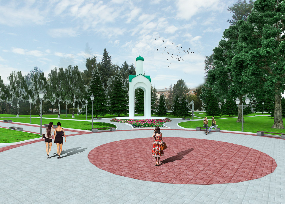 Камерный сквер в самом центре Омска неподалеку от Соборной площади по сути не нуждается в кардинальном обновлении. Его доминантной останется памятный знак о невинно репрессированных, выполненный в виде легкой, как бы парящей над окружающим пространством часовни.