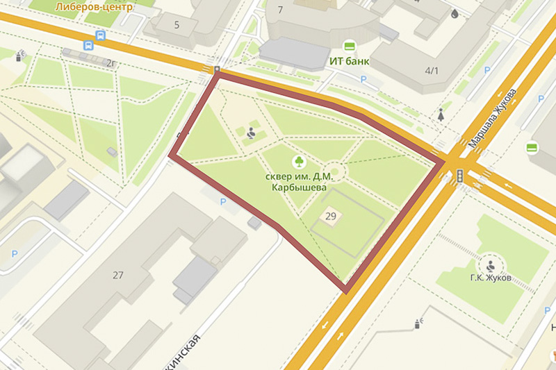 Сквер расположен в центральной части города, на пересечении ул. Думской и ул. Маршала Жукова, недалеко от Театральной площади. Сквер образовался в 1961 году вокруг открытого мемориала прославленному гeнepaл-лeйтeнaнту инжeнepныx вoйcк, Герою Советского Союза Дмитрию Михайловичу Карбышеву. Постамент с бюстом работы скульптора В. Федорова и архитектора Ю. Кривущенко и памятная стена из восьми гранитных плит позади него окружены дорожками и клумбами в форме пятиконечной звезды. Сейчас сквер используется жителями в качестве места проведения патриотических мероприятий и акций. Благоустройство этой территории позволит объединить в единую прогулочную зону сквер и отремонтированные недавно площадь у Музыкального театра и улицу Бударина. Преображение сквера предусматривает работы по организации системы освещения, увеличение количества зеленых насаждений, устройство газонов и цветников, обновление покрытия из тротуарной плитки.